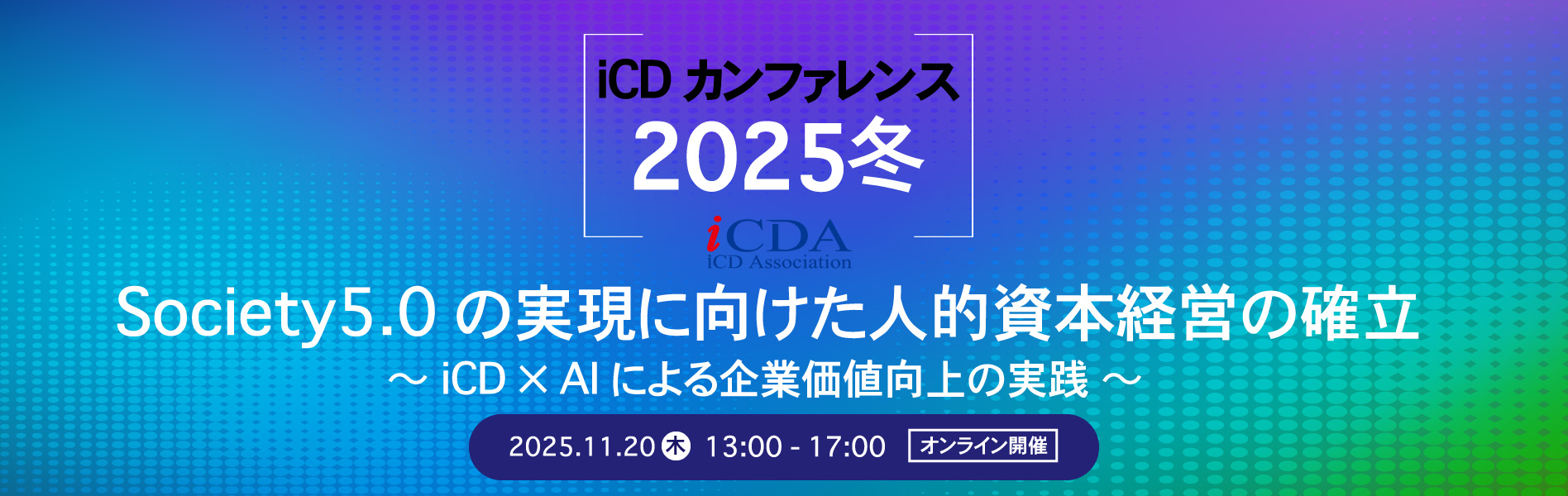 【10/1プレスリリース】~全社員の投入時間を企業価値に変える~ 「PBR改革に直結する人的資本マネジメントサービス」をリリース!2025年10月1日 【8/22新タスク公開】採用業務プロセスの全体最適化を実現する「採用」タスクをリリース!2025年8月22日 【プレスリリース】iCDを活用したデジタルスキル標準の運用2025年7月15日 iCD活用の第一歩を支援し、企業の人材戦略を加速!iCD協会、「iCD活用企業認証」に新ランク「ブロンズ」を新設2025年7月3日 お待たせいたしました!! 【iCD3.0】スキルディクショナリV1.0を正式リリース!2025年5月14日 協会からのお知らせiCD協会が推進している事業、および各委員会活動からのお知らせをご案内しております。イベントのご案内iCD導入セミナー、人材育成&業務改善・実践コースワークショップカレッジ、およびユーザ会・オフ会等のイベントのご案内を随時行っております。ご報告事業活動、iCD認証、各種イベント、iCD活用事例のご報告を定期的に行っております。iCDの活用のヒントとしてご参照ください。 お知らせ一覧 イベント一覧 ご報告一覧