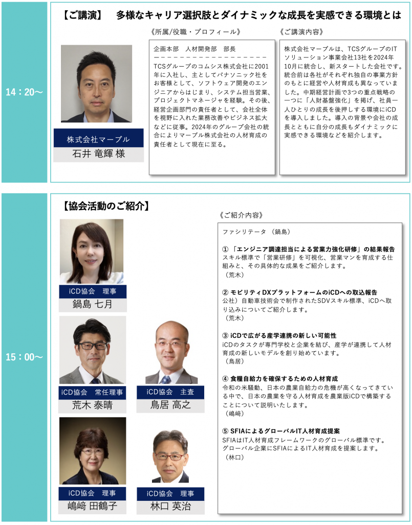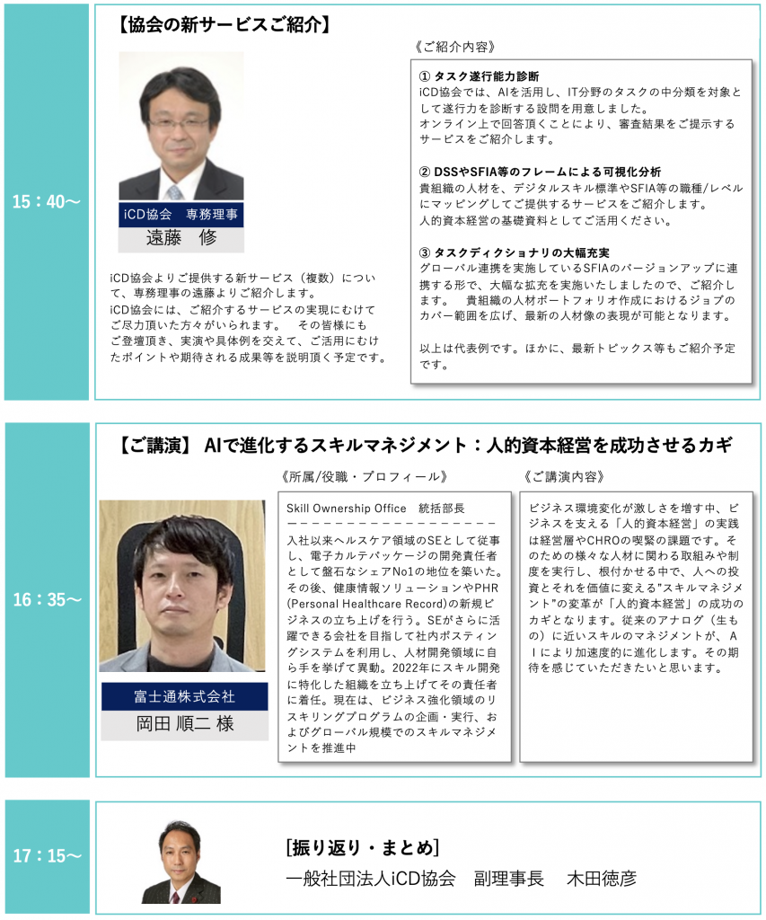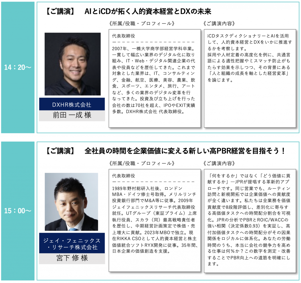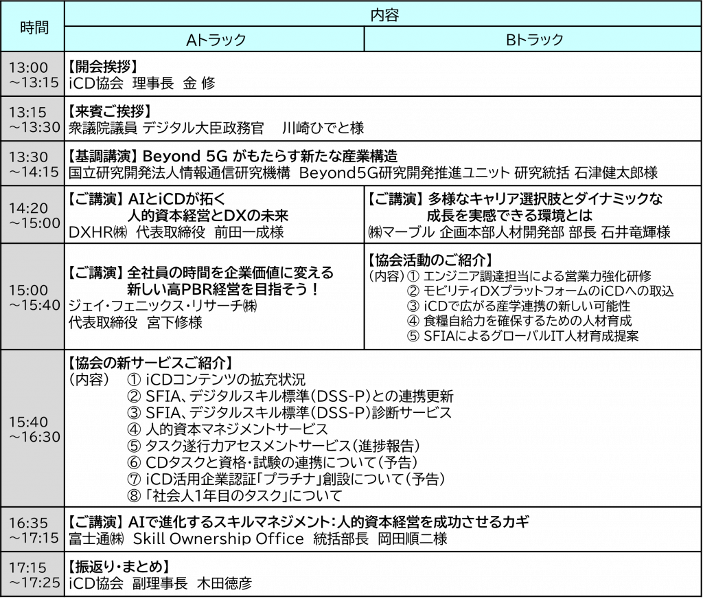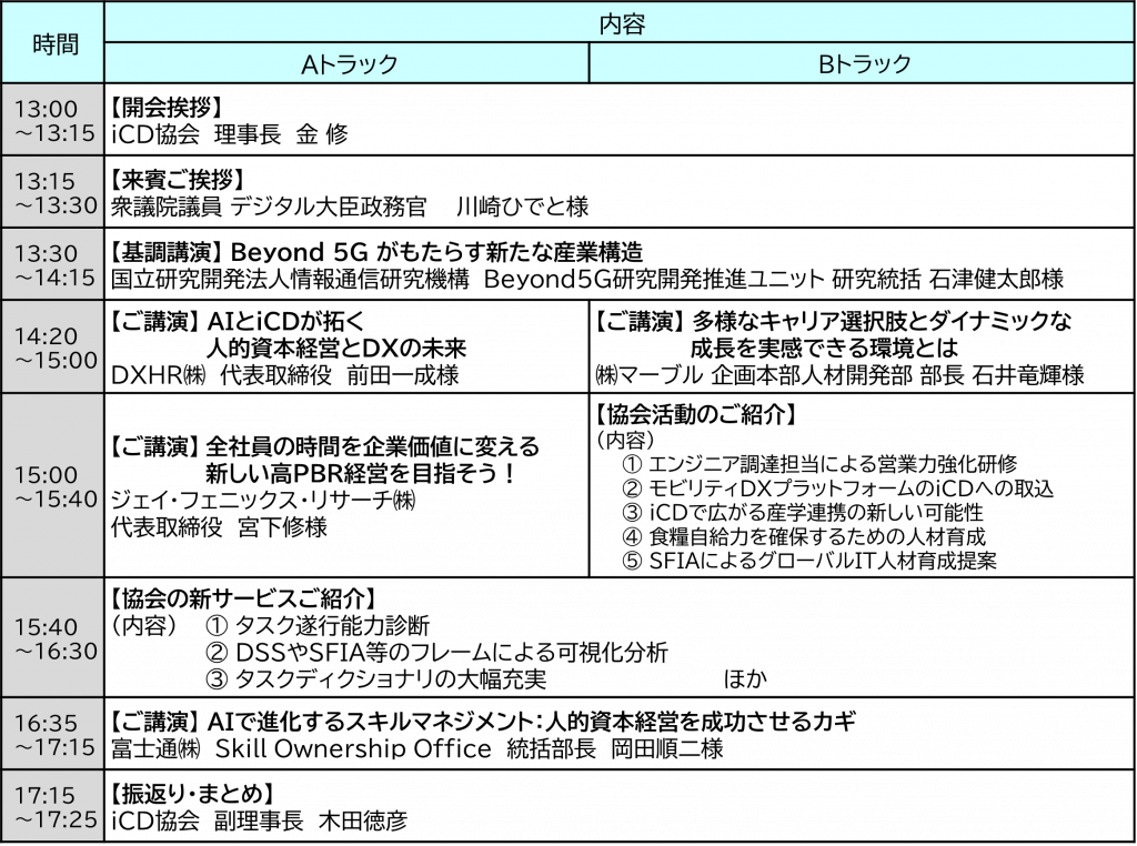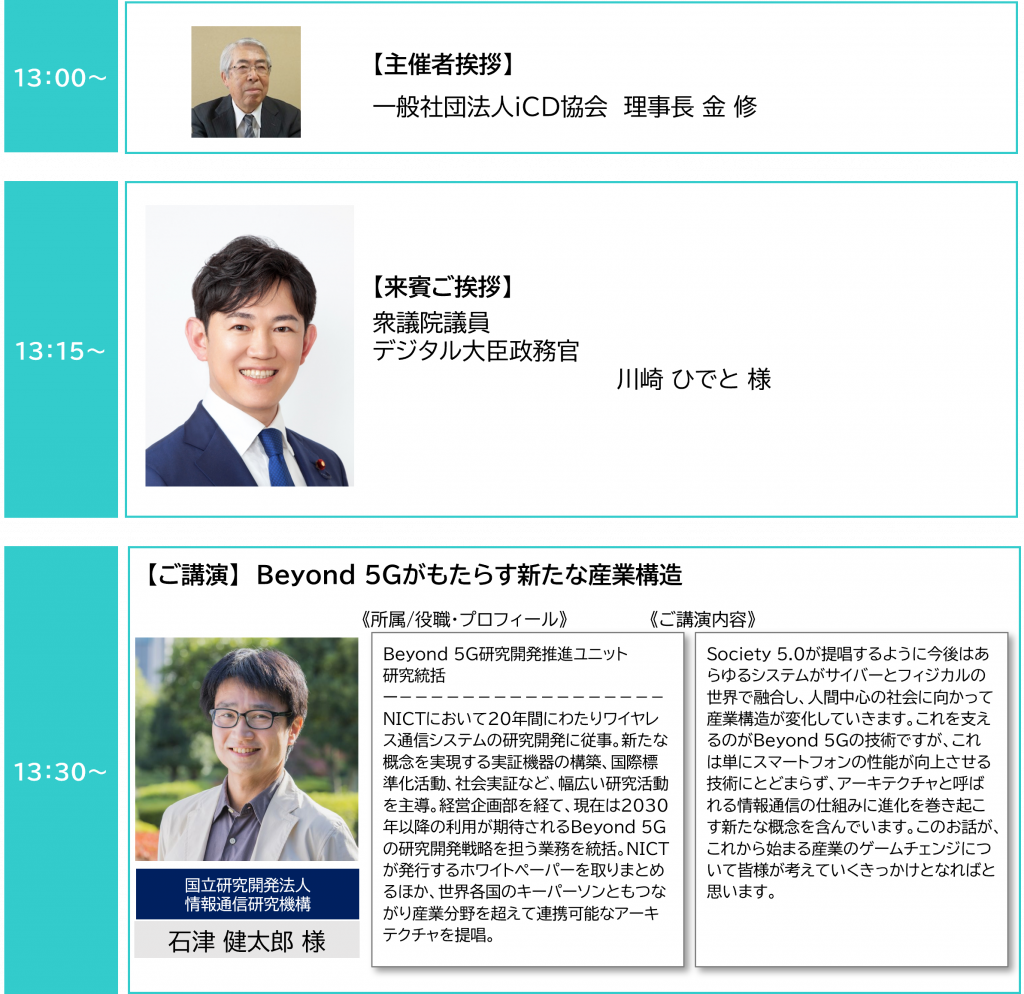 冒頭には衆議院議員 川崎ひでと様をお迎えし、Beyond 5G、AI×iCD、スキルマネジメント、高PBR経営など、次代の企業価値創造に直結する多彩な講演が並びます。